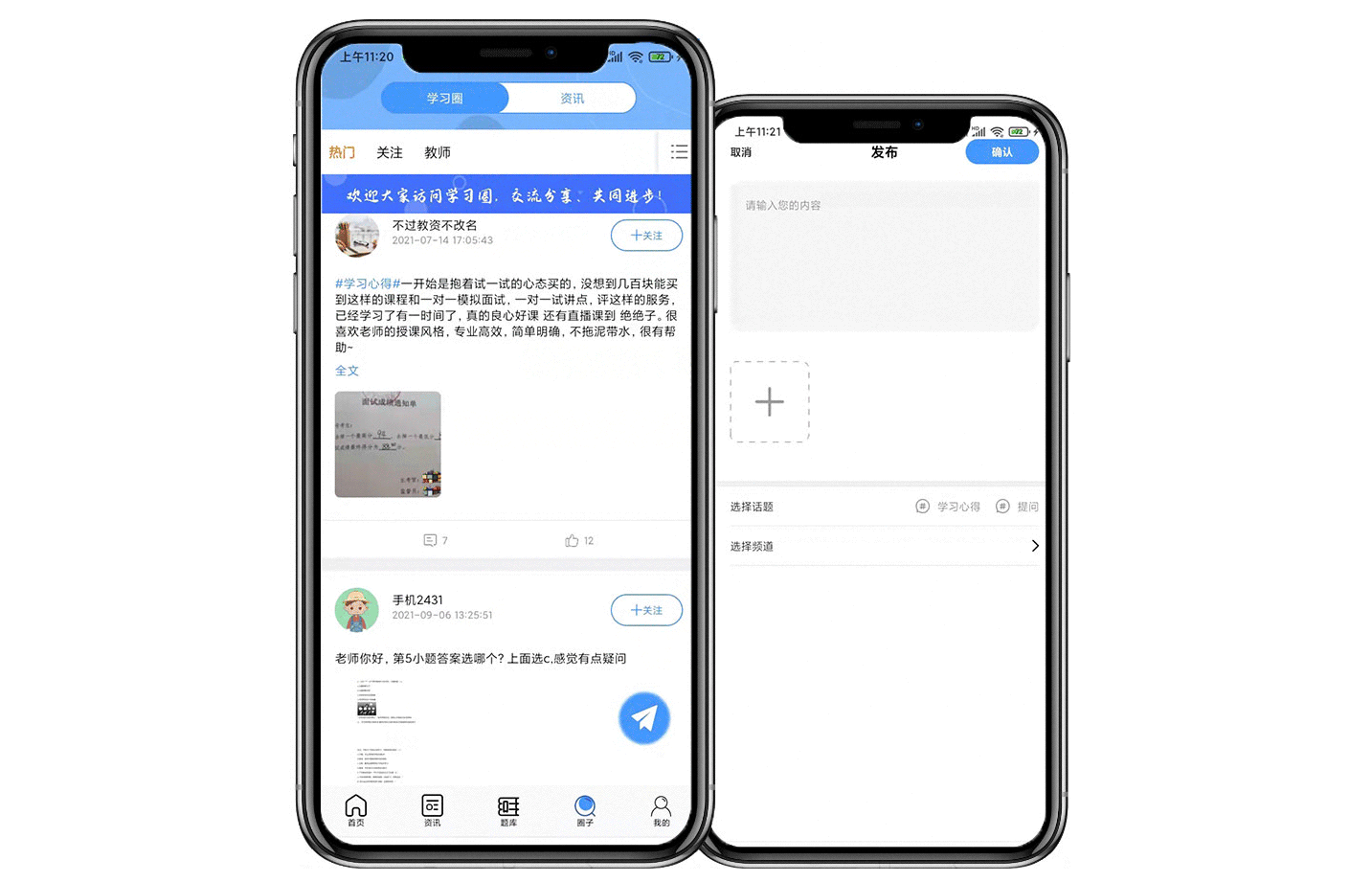 圈子动态功能,学习中遇到问题可发送动态寻找帮助,同时讲师可发布个人动态,分享直播时间、学习资料等,促进学习交流和资源分享。